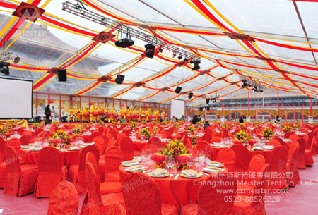 邁斯特篷房廠家專業(yè)生產(chǎn)各種婚禮慶典篷房,跨度從3-50米不等,提供的選擇較多。而從外觀方面也有多種選擇:人字頂篷房、歐式尖頂篷房等等。篷布可以選用白色、紅色或透明,也可以選擇玻璃幕墻等硬體墻,使整個婚禮慶典更加高大上。