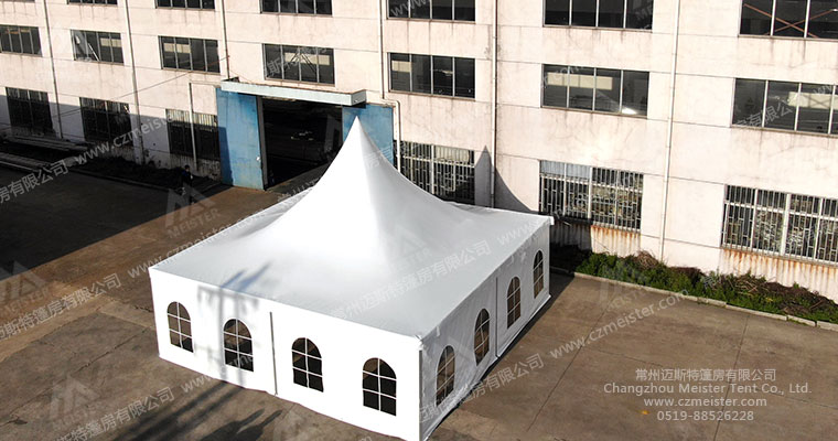 此組四角尖頂篷房的跨度是10*10m,檐高2.5m,外形小巧玲瓏,可以當(dāng)做小型倉庫,也可以用來舉辦私人派對、活動接待、安全檢查崗。